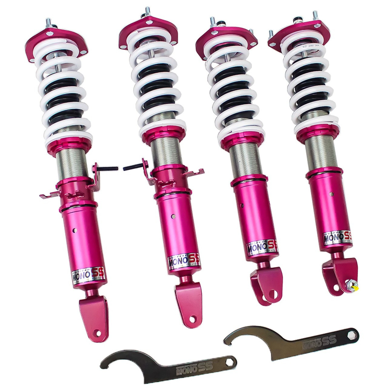 Godspeed Project's MonoSS is our one entity in our family of single-adjustable coilover suspension kits. These coilovers are designed to be a streetable race built coilover at an affordable price. It features a monotube damper that is made out of a carbon seamless steel 52mm tube with a performance internal piston providing maximum damper response. The cold-bent springs are made from high strength SAE9252 steel to optimize the balance between performance and comfort. Using race quality shock oil, Godspeed Project can guarantee exceptional damper performance at any temperature on and off the track. The top of the shock is attached to the car using a high quality top hat that features a high performance Japanese KOYO 6204Z bearing pillow ball mount (when applicable). The bottom shock brackets are made out of a T7075 forged aluminum or carbon steel brackets for lighter weight without sacrificing durability which also includes brake line brackets (when applicable). The MonoSS offers 16 level of damper adjustability which can be set to your preference.