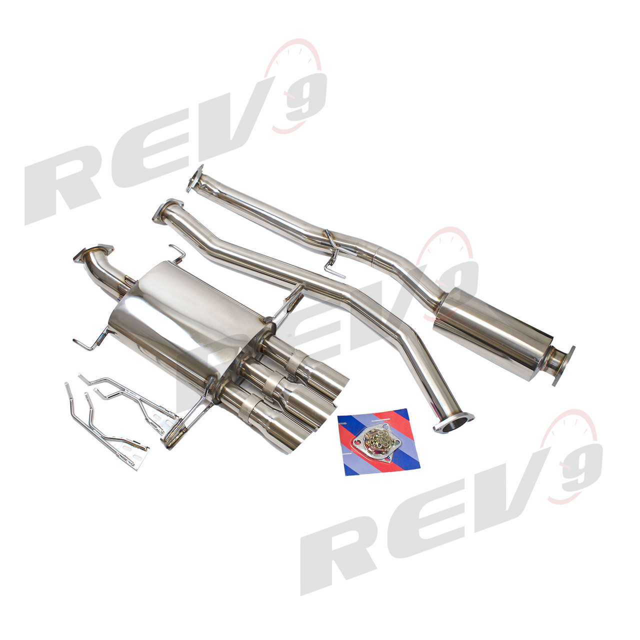 Rev9 FlowMAXX Cat-Back exhaust will give the JDM race-proven performance as well as performance car exhaust note. Made of stainless steel for long lasting corrosion protection, featuring 3 exhaust tips for that elegant sports look. Choose from sports muffler or straight pipe for that awesome performance car rumbling exhaust sound!