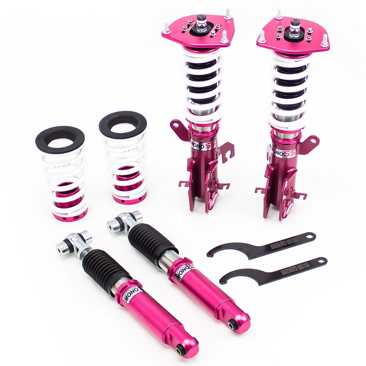 Godspeed Project's MonoSS is our one entity in our family of single-adjustable coilover suspension kits. These coilovers are designed to be a streetable race built coilover at an affordable price. It features a monotube damper that is made out of a carbon seamless steel 52mm tube with a performance internal piston providing maximum damper response. The cold-bent springs are made from high strength SAE9252 steel to optimize the balance between performance and comfort. Using race quality shock oil, Godspeed Project can guarantee exceptional damper performance at any temperature on and off the track. The top of the shock is attached to the car using a high quality top hat that features a high performance Japanese KOYO 6204Z bearing pillow ball mount (when applicable). The bottom shock brackets are made out of a T7075 forged aluminum or carbon steel brackets for lighter weight without sacrificing durability which also includes brake line brackets (when applicable). The MonoSS offers 16 level of damper adjustability which can be set to your preference.