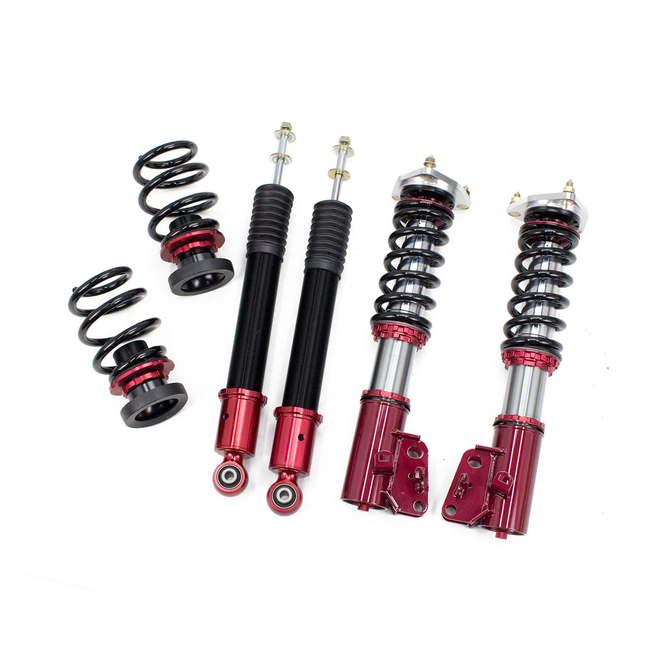 Godspeed Project's MAXX Sports line is engineered to be more track oriented coil-over system. Utilized "Inverted" mono-tube shocks to replace where MacPherson struts are used for better rigidity. All mono-tube shocks are finished with anti-corrosion coating and special valving that allows 33 levels adjustments to control the rebound damping force. Pillow ball top mounts are used on four corners to provide far more precise feel from the suspension and steering. With high rigidity steel coil springs to provides more control and quick steering to improve overall handling of the vehicle. Aluminum hardware are used where applicable to reduce overall weight.