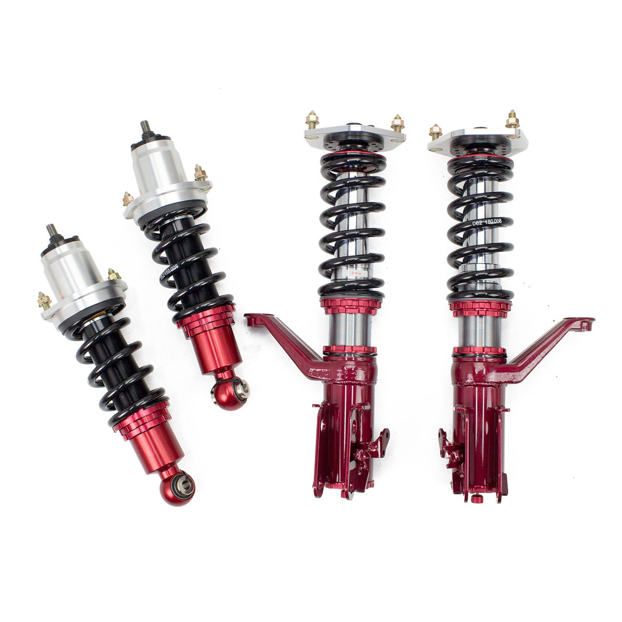 Godspeed Project's MAXX Sports line is engineered to be more track oriented coil-over system. Utilized "Inverted" mono-tube shocks to replace where MacPherson struts are used for better rigidity. All mono-tube shocks are finished with anti-corrosion coating and special valving that allows 33 levels adjustments to control the rebound damping force. Pillow ball top mounts are used on four corners to provide far more precise feel from the suspension and steering. With high rigidity steel coil springs to provides more control and quick steering to improve overall handling of the vehicle. Aluminum hardware are used where applicable to reduce overall weight.